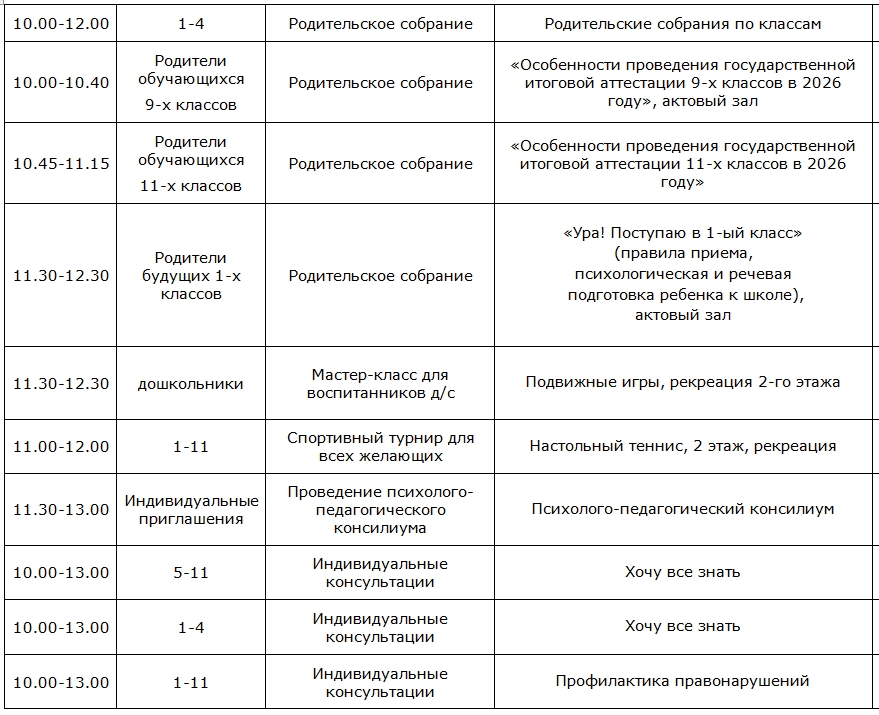pdf, 216475KB Полный список. Мероприятия дня открытых дверей 7 февраля 2026 годаСписок кабинетов, в которых учителя-предметники 5-11 классов будут проводить консультации дял родителей, будет размещен утром 7 февраля в вестибюле школы, а также опубликован на канале школы в МАХ.